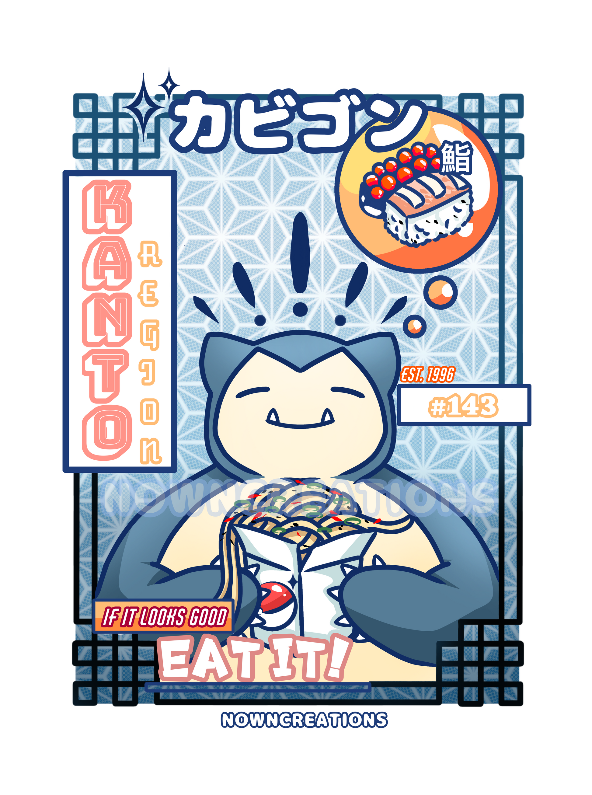 Inspired by our love for food and pokemon, here is our next installment in our artwork series! The ultimate goal is to have all designs from generation 1 completed to make a full wall display. Start your collection now with this print! (Watermark will not be on final print/only used for online purposes)